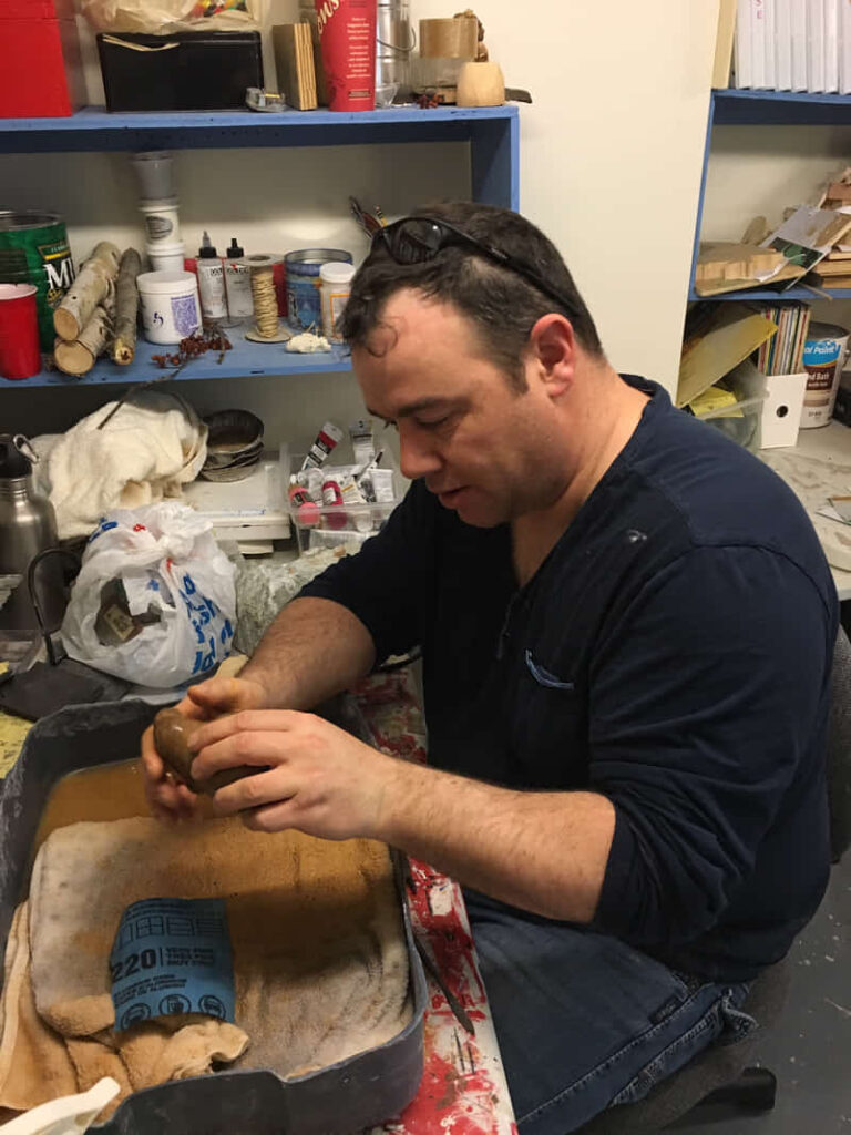 In 2015, Ryan was introduced to local artist, Ted Griffiths, who began mentoring him in working with soapstone. He is fortunate to have a workshop and studio located at his home. Ryan has created a number of stone works that are in homes both nationally and internationally. Currently Ryan’s stone carvings can be found in galleries in Alberta, Canada.